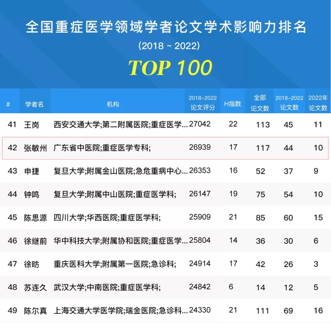 4月20日,“2018-2022年全国重症医学领域学者论文学术影响力排名TOP100”榜单发布。beat365第二附属医院(广东省中医院)重症医学科学术带头人张敏州教授全国排名42,是全国中医医院唯一入选百强排名的专家!