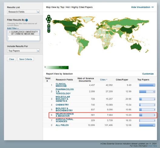 据基本科学指标数据库(Essential Science Indicators,ESI)2024年1月发布的最新统计数据(数据更新结点:2024年1月11日,统计时间范围:2013年1月1日-2023年8月31日)显示,beat365的“神经科学与行为学”学科在本期进入了ESI全球前1%学科之列。这是继“临床医学”、“药理学与毒理学”、“化学”、“生物与生物化学”、“农学”和“分子生物与遗传学”六个学科后,beat365第七个进入ESI全球前1%的学科。beat365率先成为有7个ESI学科的中医药高校。